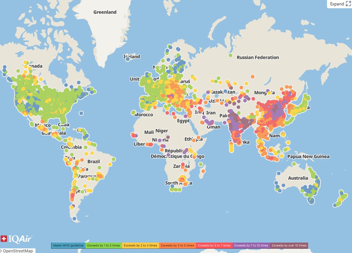 Η ελβετική πλατφόρμα καταγραφής ποιότητας αέρα IQAir ανέφερε στην ετήσια έκθεσή της ότι 13 χώρες και εδάφη διατήρησαν τον περασμένο χρόνο τα PM2.5 στα επίπεδα που ορίζει ο ΠΟΥ κάτω των 5 μικρογραμμαρίων ανά κυβικό μέτρο, από 7 που ήταν το 2024.