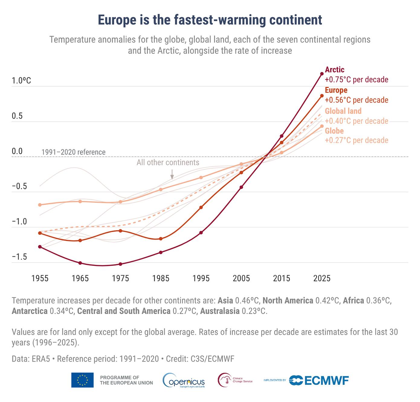 Η Ευρώπη σε συντριπτικό ποσοστό, τουλάχιστον 95%, βίωσε το 2025 ετήσιες θερμοκρασίες άνω του μέσου όρου, με τα κύματα καύσωνα να επηρεάζουν μεγάλα τμήματα της ηπείρου, από τη Μεσόγειο ως την Αρκτική. Η ραγδαία αύξηση της θερμοκρασίας είχε ως αποτέλεσμα τη μείωση κάλυψης χιονιού και πάγου, που παίζουν κρίσιμο ρόλο στην επιβράδυνση της κλιματικής αλλαγής.