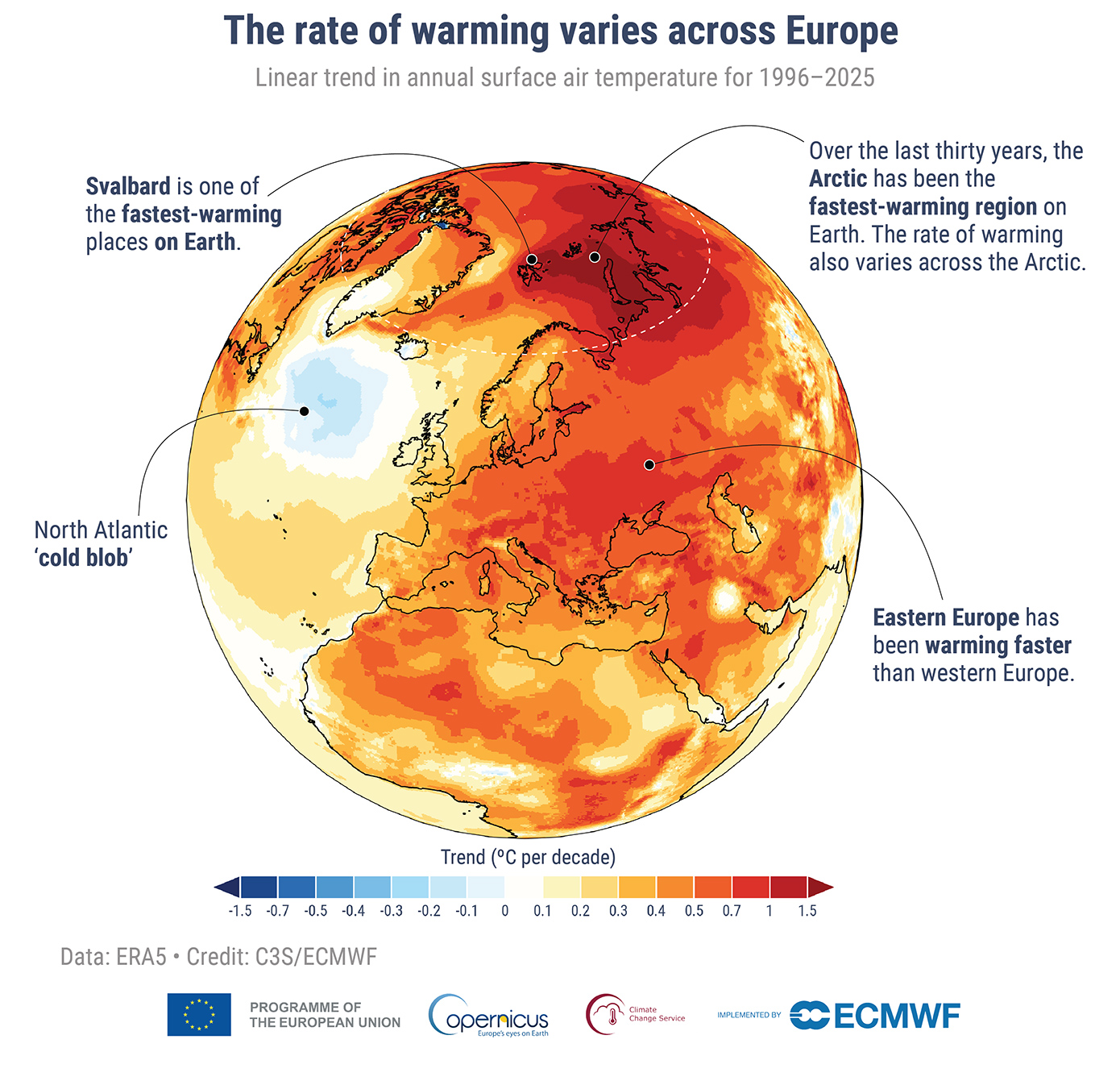 Όπως διαπιστώνεται στην έκθεση, τα τελευταία 30 χρόνια η Ευρώπη θερμαίνεται δύο φορές πιο γρήγορα από τον παγκόσμιο μέσο όρο και αυτό την καθιστά την ταχύτερα θερμαινόμενη ήπειρο στον πλανήτη, με την Ανατολική και Νοτιοανατολική Ευρώπη να θερμαίνονται ταχύτερα από τη Δυτική Ευρώπη και τα νησιά Σβάλμπαρντ στον ευρωπαϊκό Αρκτικό Ωκεανό να είναι μία από τις ταχύτερα θερμαινόμενες περιοχές στον πλανήτη.
