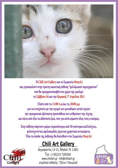Έτσι λοιπόν, το Σαββατοκύριακο 16 και 17 Απριλίου, από τις 11:00 έως τις 20:00 το Stray.Gr και η Chili Art Gallery, σας προσκαλούν να επισκεφθείτε το χώρο της και να ενισχύσετε με την αγορά των μοναδικών αυτών έργων την πραγματικά αξιέπαινη αυτή προσπάθεια.