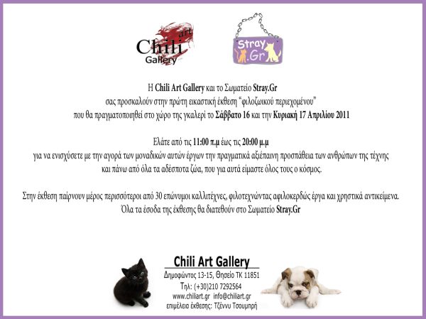 Πριν από λίγους μήνες η καλλιτεχνική διευθύντρια της Chili Art Gallery, Τζέννυ Τσουμπρή είχε την ιδέα να καλέσει καλλιτέχνες, συνεργάτες της γκαλερί και μη, για να φιλοτεχνήσουν κάποια έργα αλλά και χρηστικά αντικείμενα (περιλαίμια, λουράκια, μπολ φαγητού, ρουχαλάκια κλπ), με σκοπό να πουληθούν σε μία έκθεση «φιλοζωικού περιεχομένου», η οποία θα πραγματοποιηθεί και θα διαρκέσει από το Σάββατο 16 έως και την Κυριακή 17 Απριλίου 2011.