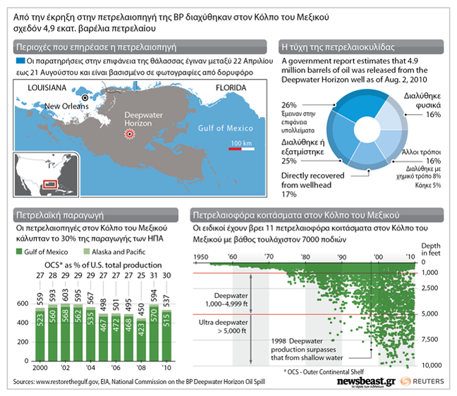 Περίπου 4,9 εκατ. βαρέλια πετρελαίου διαχύθηκαν στη θάλασσα μετά την έκρηξη στην πετρελαιοπηγή της BP. Tο πετρέλαιο στον Κόλπο του Μεξικού απλώθηκε σε μια ακτίνα 320 χλμ.