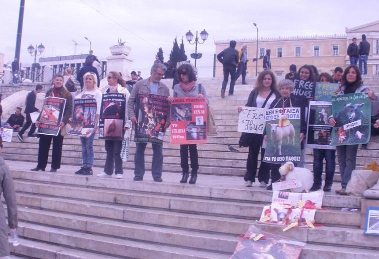 Με αφορμή την Κυριακή του Πάσχα που πλησιάζει και την σφαγή χιλιάδων αμνών για κατανάλωση, οι Πολίτες για τα δικαιώματα της Φύσης και της Ζωής (ΠΟ.ΦΥ.ΖΩ.) συγκεντρώθηκαν την Κυριακή 17/4 στο Σύνταγμα και διαμαρτυρήθηκαν ενάντια στην κρεατοφαγία.