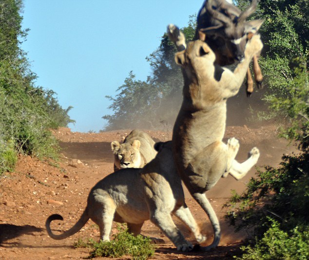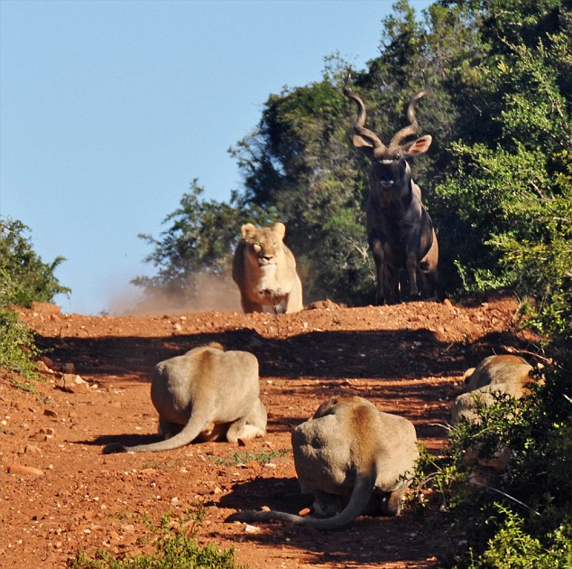 Με το που εντόπισαν το «γεύμα» τους τρία λιοντάρια το περίμεναν ξαπλωμένα στο έδαφος να πλησιάζει, ενώ το τέταρτο ακολουθούσε από πίσω.