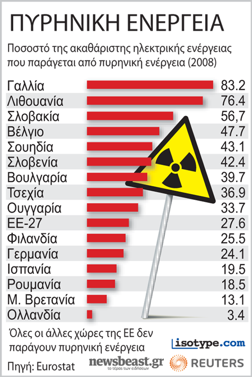 Στην κορυφή των χωρών που χρησιμοποιούν την πυρηνική ενέργεια για την παραγωγή ηλεκτρισμού βρίσκεται η Γαλλία, σύμφωνα με την κατάταξη που έδωσε στη δημοσιότητα το διεθνές ειδησεογραφικό πρακτορείο Reuters.