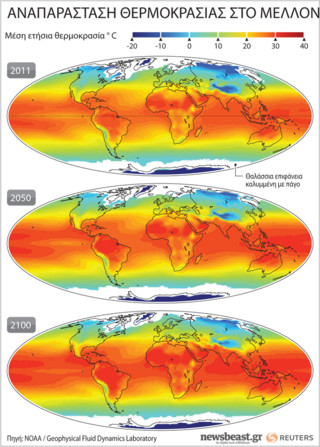 Οι προβλέψεις των επιστημόνων για την άνοδο της μέσης θερμοκρασίας του πλανήτη είναι δυσοίωνες. Παρακάτω παρατίθεται σχετικό γράφημα του Reuters για το πώς προβλέπεται ότι θα κυμανθεί η μέση θερμοκρασία της Γης το 2050 και το 2100.