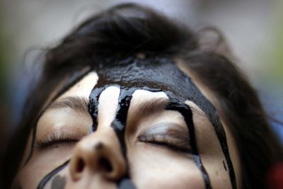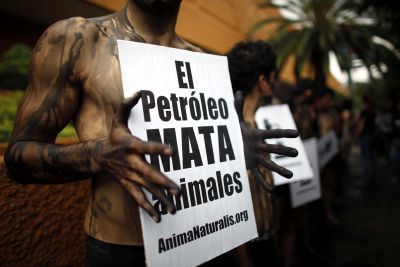 Κάλυψαν το σώμα τους με χρώμα τροφίμων που φαίνεται σαν πετρέλαιο φώναξαν «Το πετρέλαιο σκοτώνει ζώα.