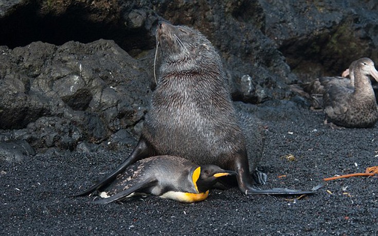 Στα νησάκια βόρεια της Ανταρκτικής οι επιστήμονες έχουν καταγράψει ένα εξαίσιο δείγμα αυτού που χαρακτηρίζεται ως «εξαναγκασμένη συνουσία» μεταξύ δύο ειδών: ο δράστης είναι θηλαστικό, η φώκια της Ανταρκτικής, και το θύμα είναι πτηνό, ο βασιλικός πιγκουίνος. Κατά το σκηνικό της επίθεσης, η αρσενική φώκια κυνηγά τον πιγκουίνο, τον πιάνει, τον καθηλώνει και μετά τον βιάζει. Ο βιασμός διαρκεί μάλιστα ώρες και η φώκια σταματά συχνά πυκνά για να ξεκουραστεί, συνεχίζοντας πάντα να κρατά εγκλωβισμένο τον άμοιρο πιγκουίνο με το βάρος της.