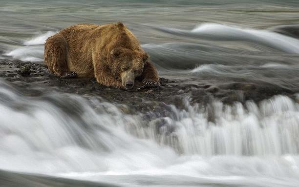 Ο φωτογράφος άγριας φύσης Μάρσελ Βαν Όοστεν απαθανάτισε τη μοναδική αυτή στιγμή και δήλωσε : «Ακόμη κι όταν τα ποτάμια είναι γεμάτα απαιτείται ιδιαίτερη ικανότητα και υπομονή για να πιάσουν οι αρκούδες ένα ψάρι. Και είναι γεγονός ότι κάποιες αρκούδες τα καταφέρνουν καλύτερα από κάποιες άλλες. Η συγκεκριμένη αρκούδα στεκόταν στο ίδιο σημείο επί σειρά ωρών και δεν έπιασε το παραμικρό. Τελικά κουράστηκε και αποφάσισε να ρίξει έναν υπνάκο».
