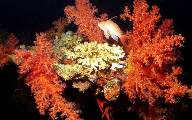 Η υποβρύχια αυτή φωτογραφία κέρδισε στην κατηγορία «Οικοσυστήματα και κοινότητες». Ψάρι του είδους lyretail anthias απεικονίζεται με φόντο την… κοραλιογενή «ιδιοκτησία» του.