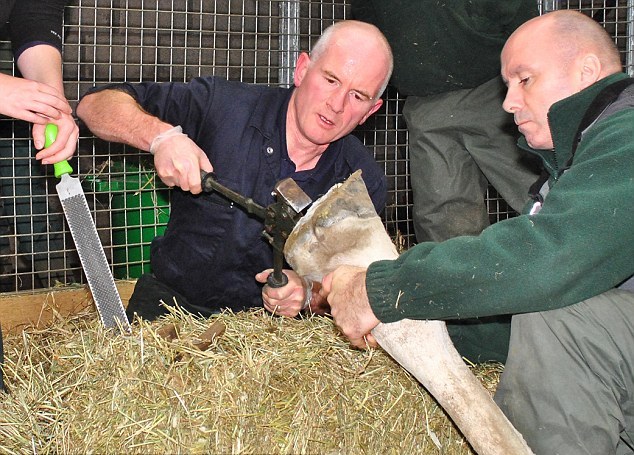Διαφορετικά η 17χρονη καμηλοπάρδαλη θα είχε προβλήματα στους αστραγάλους της, επειδή οι οπλές της είχαν μεγαλώσει πολύ.