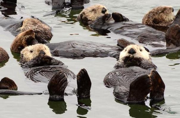 Δύο θαλάσσιες ενυδρίδες ξυπνούν και σηκώνουν το κεφάλι τους, ενώ η υπόλοιπη ομάδα συνεχίζει να απολαμβάνει τον υπνάκο της στις ακτές του Moss Landing στην Καλιφόρνια.