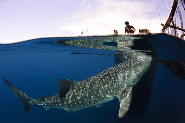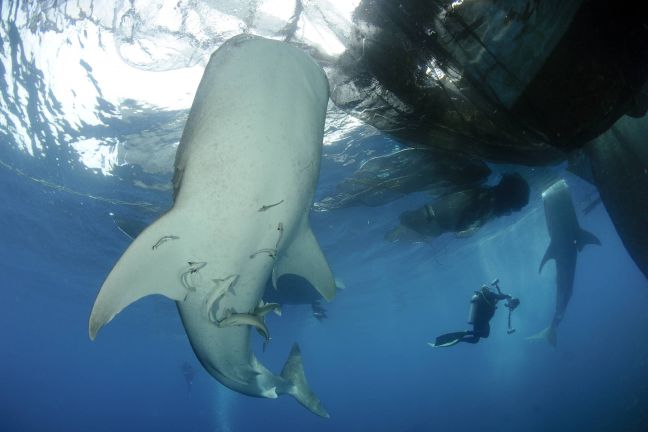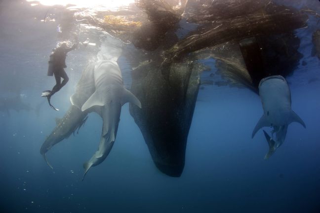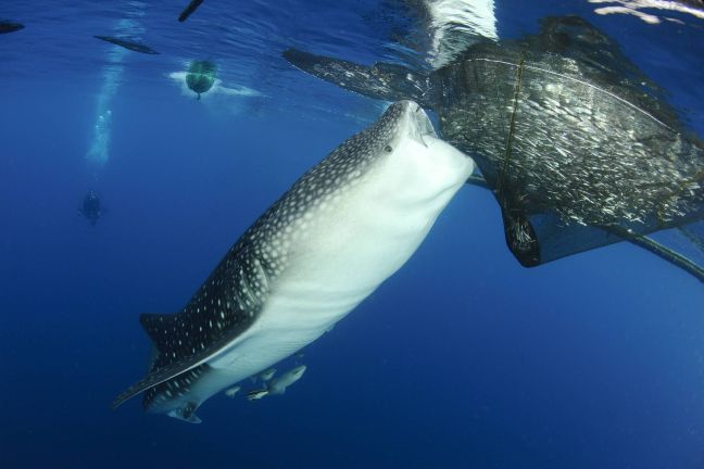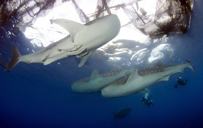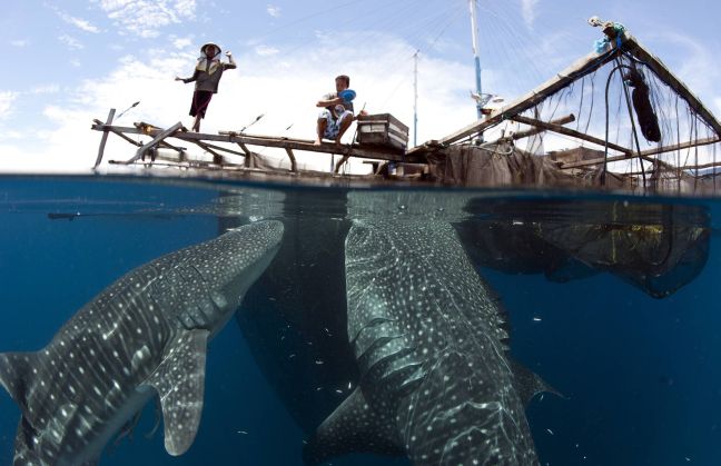 Οι τεράστιοι φαλαινοκαρχαρίες πιάστηκαν επ’ αυτοφώρω να κλέβουν ψάρια από τα δίχτυα ψαράδων. Εικόνες σαν κι αυτές βλέπουν για πρώτη φορά τα φώτα της δημοσιότητας.