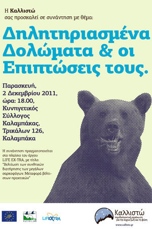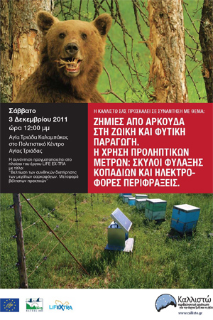 Η δεύτερη ενημερωτική συνάντηση διοργανώνεται το Σάββατο 3 Δεκεμβρίου στο Πολιτιστικό Κέντρο Αγίας Τριάδας Καλαμπάκας με θέμα: «Ζημιές από αρκούδα στη ζωική και φυτική παραγωγή. Η χρήση προληπτικών μέτρων: Σκύλοι Φύλαξης Κοπαδιών και Ηλεκτροφόρες Περιφράξεις».