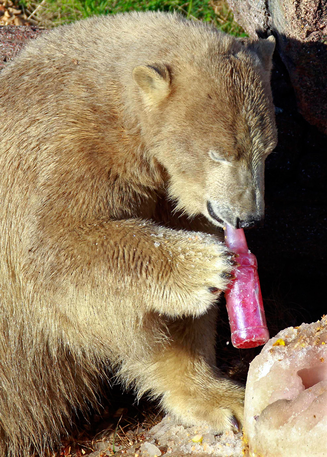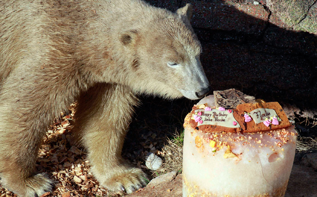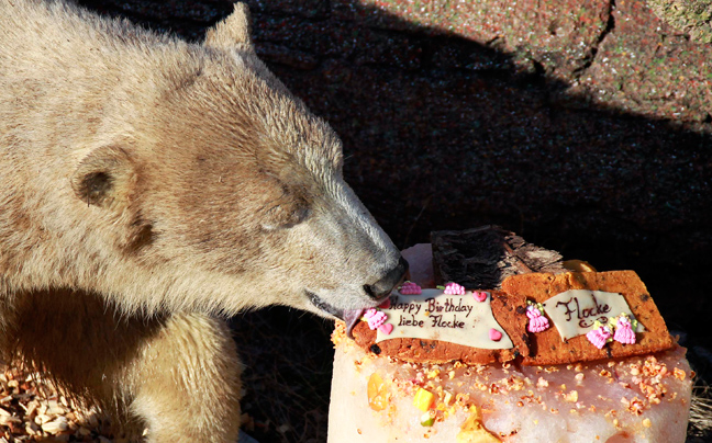 Η Flocke έγινε τεσσάρων και το γιορτάζει στο θαλάσσιο πάρκο Marineland στη νοτιοανατολική Γαλλία. Η πολική αρκούδα γεννήθηκε στη Γερμανία και μεταφέρθηκε στη Γαλλία το Μάιο του 2010.