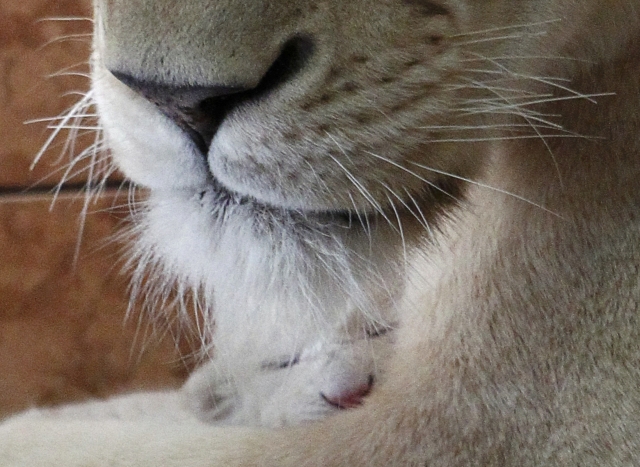Τέσσερα λευκά νεογέννητα λιονταράκια δεν φεύγουν λεπτό από την τρυφερή αγκαλιά της μητέρας τους Sumba.