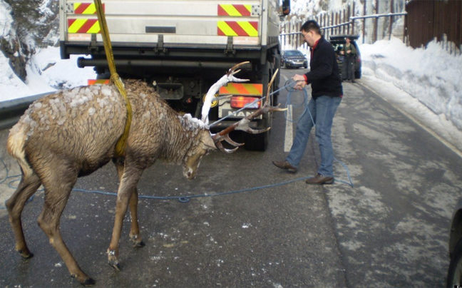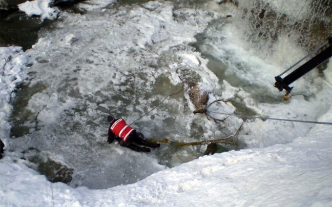 Ομάδα εθελοντών επιχείρησε αρχικά να το τραβήξει έξω αλλά το ελάφι γλίστρησε στον πάγο και έπεσε μέσα στο νερό παρασύροντας μάλιστα μαζί του ένας κτηνίατρο κι ένα διασώστη!