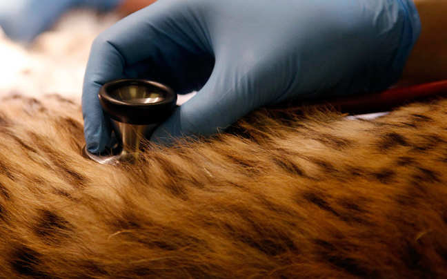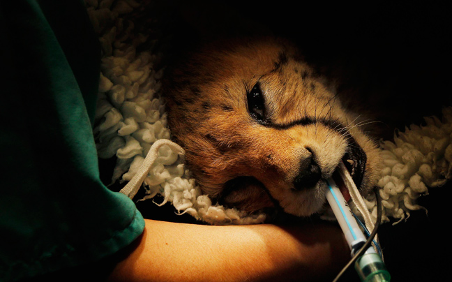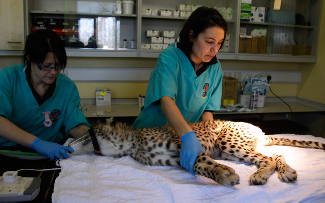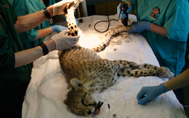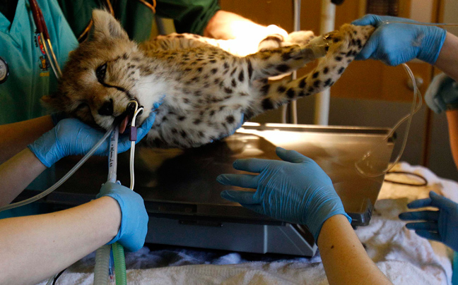 Ο μόλις εννέα μηνών Juba, το μικρό τσιτάχ της φωτογραφίας, δέχεται τη φροντίδα των κτηνιάτρων καθώς υποβάλλεται σε επέμβαση στον ζωολογικό κήπο Chester στη βόρεια Αγγλία.