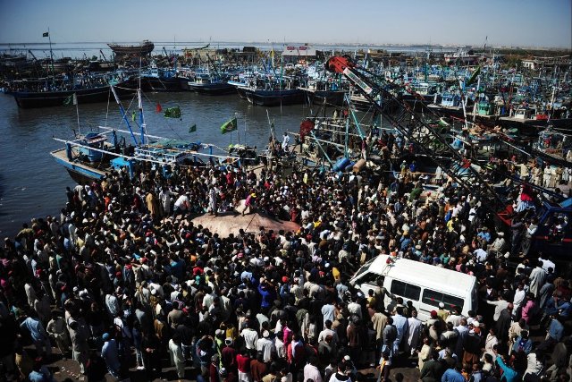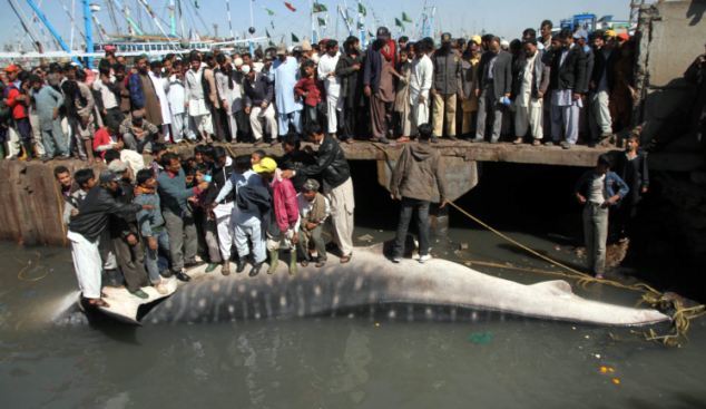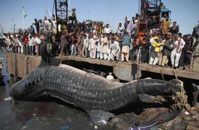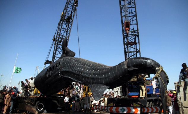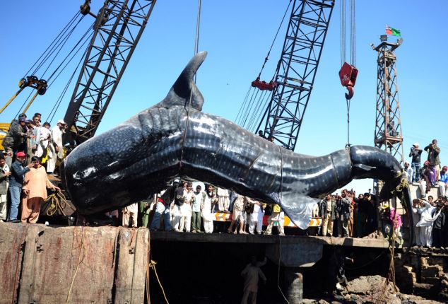 Πλήθος κόσμου συγκεντρώθηκε στο λιμάνι του Καράτσι στο Πακιστάν προκειμένου να παρακολουθήσει το θέαμα της ανέλκυσης ενός τεράστιου φαλαινοκαρχαρία που βρέθηκε να πλέει νεκρό στα ανοιχτά της Αραβικής Θάλασσας.