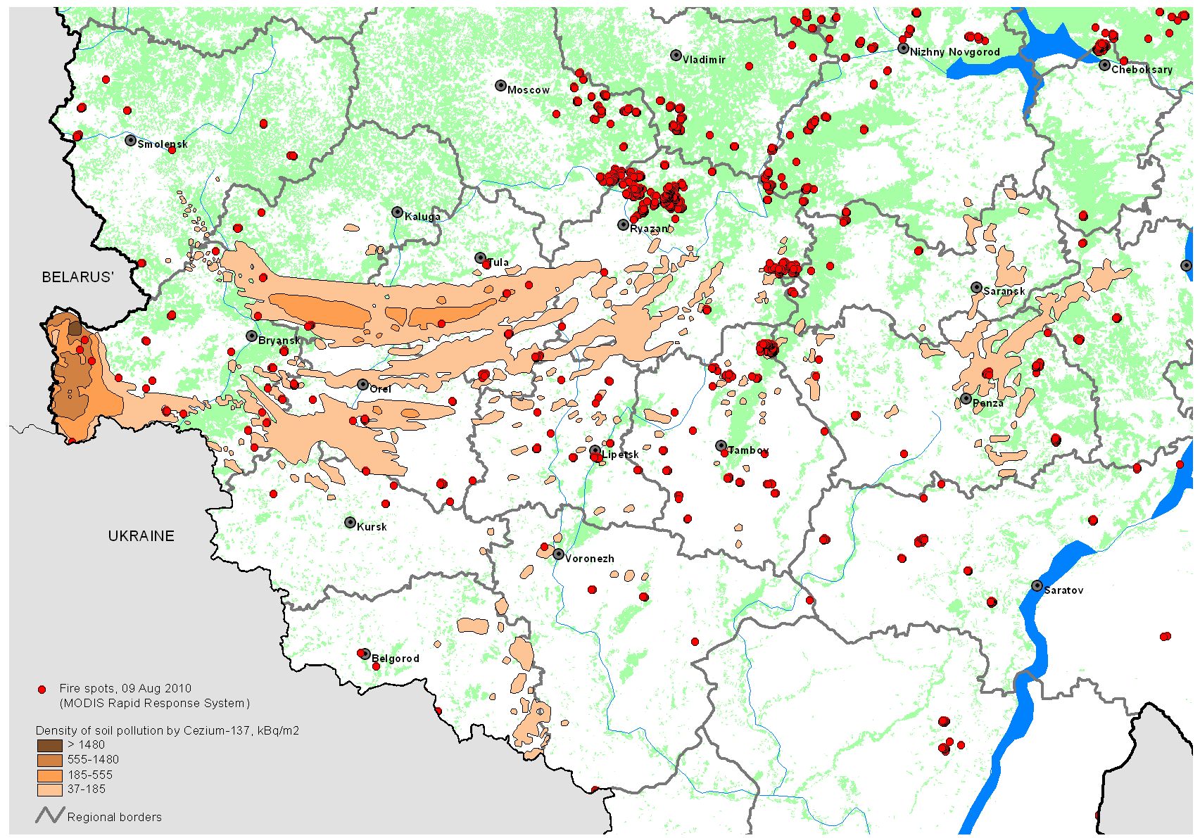 Συγκεκριμένα, το γραφείο της Greenpeace στη Μόσχα έδωσε στη δημοσιότητα τον παρακάτω χάρτη, που δείχνει ότι οι πυρκαγιές εξαπλώνονται σε τουλάχιστον 20 περιοχές επιβαρυμένες με ραδιενεργό καίσιο από το ατύχημα του Τσερνομπίλ. Τρεις πυρκαγιές, έχουν εντοπιστεί στην περιοχή Μπρίανσκ, που συνορεύει με την Ουκρανία και την Λευκορωσία, και μολύνθηκε από το ραδιενεργό σύννεφο που σχηματίστηκε μετά την έκρηξη στον αντιδραστήρα αρ.4 του πυρηνικού σταθμού του Τσερνομπίλ.