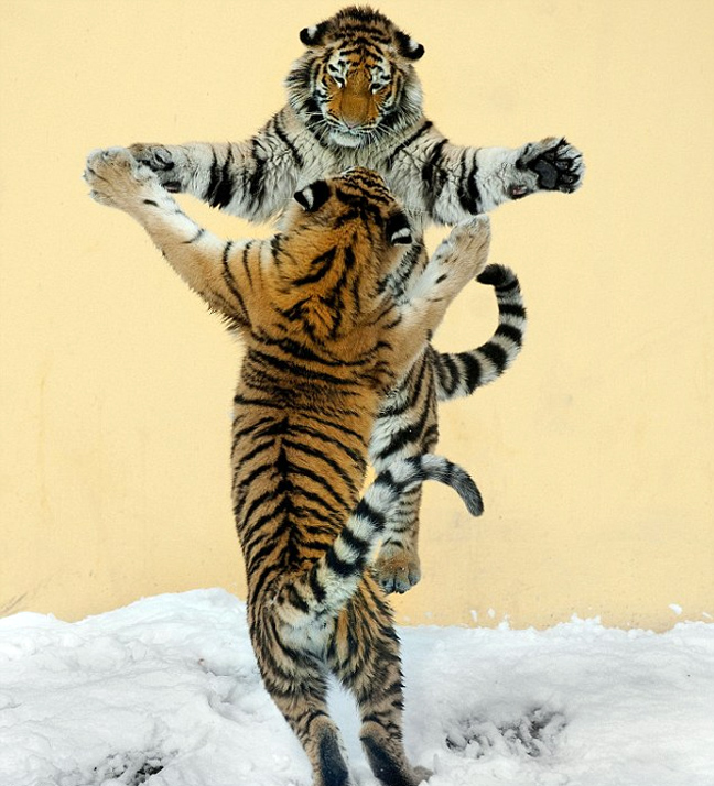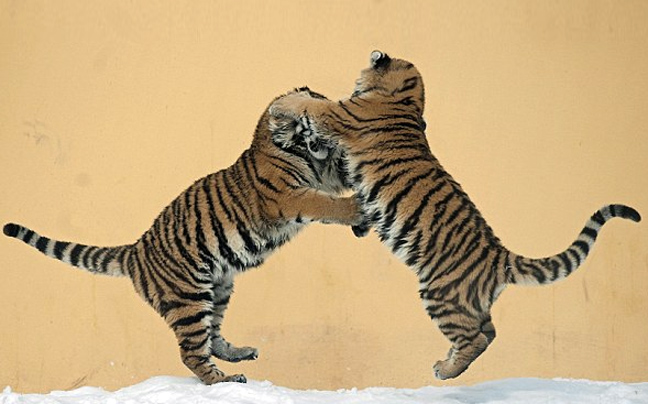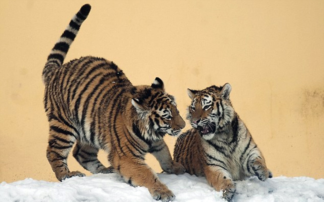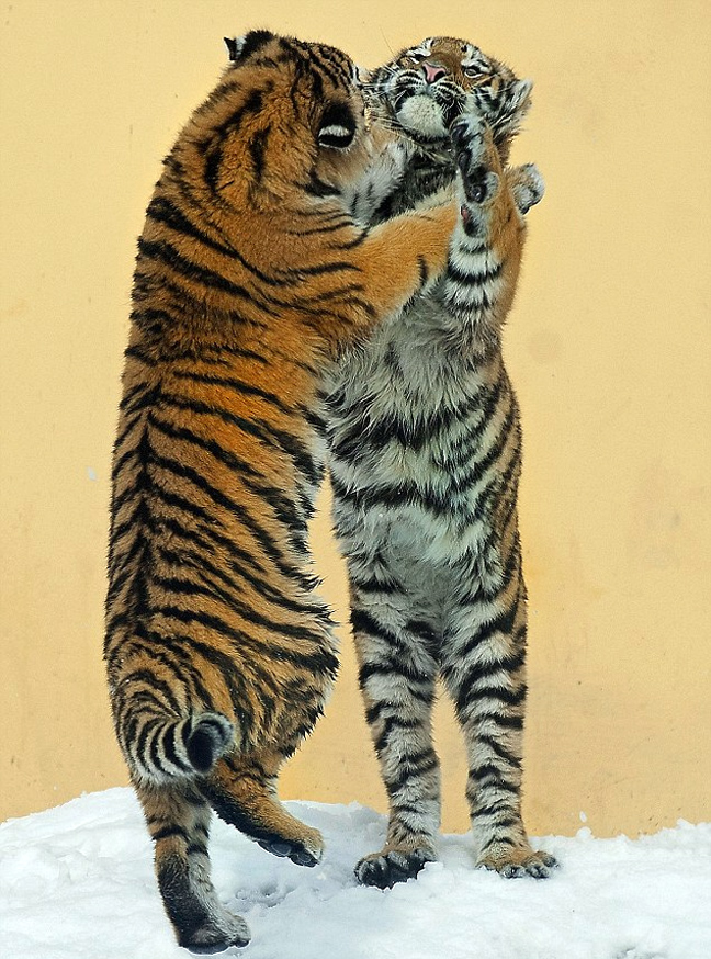 Το χιόνι είναι το κατάλληλο περιβάλλον για παιχνίδι για όλα τα είδη… δίποδα και τετράποδα… και οι τίγρεις της Σιβηρίας δεν έχασαν την ευκαιρία στο Ζωολογικό Κήπο της Βιέννης.