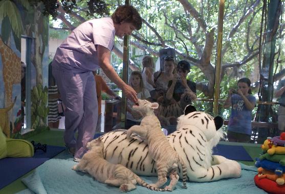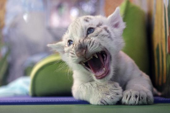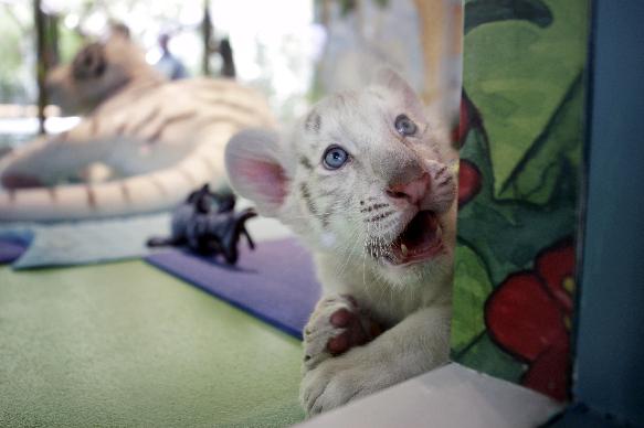 Ο Ματζέστικ και ο Μόχαν, οι μικρές λευκές τίγρεις της φωτογραφίας, παίζουν με τη λούτρινη «μαμά» τους, στο Mirage hotel-casino στο Λας Βέγκας. Τα δύο μικρά θεωρούνται σπάνια καθώς οι γονείς τους αποτελούν μέρος του προγράμματος εκτροφής των Siegfried & Roy και είναι φορείς του σπάνιου γονιδίου που είναι απαραίτητο για να προκύψουν λευκοί απόγονοι.