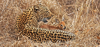 Αυτή τη πρώτη συνάντηση της λεοπάρδαλης με τη νεογέννητη αντιλόπη, συνέλαβε στο φακό του ένας οδηγός σαφάρι στο αποθεματικό ζωολογικό πάρκο «Sabi Sand Game», στη Νότια Αφρική.