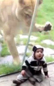 Όλα εξελίσσονταν ομαλά, μέχρι τη στιγμή που ο μπόμπιρας, έκατσε έξω από το κλουβί με τα λιοντάρια. Ήταν ενθουσιασμένος, χτυπούσε παλαμάκια και χαιρόταν πάρα πολύ που έβλεπε από τόσο κοντά τα ζώα που πρωταγωνιστούσαν στα παραμύθια του. Μάλιστα κολλούσε και το πρόσωπό του στο τζάμι για να βλέπει καλύτερα.