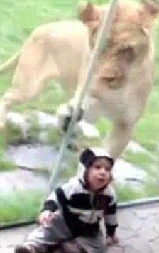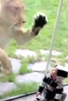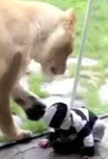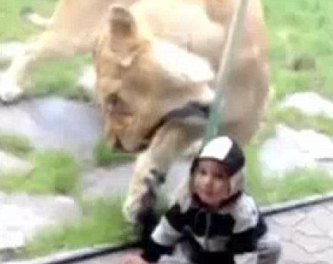 Στο βίντεο φαίνεται η στιγμή που η λέαινα προσπαθεί να κατασπαράξει το μωρό που κάθεται μπροστά της. Όμως, χωρίς το άθραυστο προστατευτικό γυαλί που τη χώριζε από το χαριτωμένο αγοράκι.