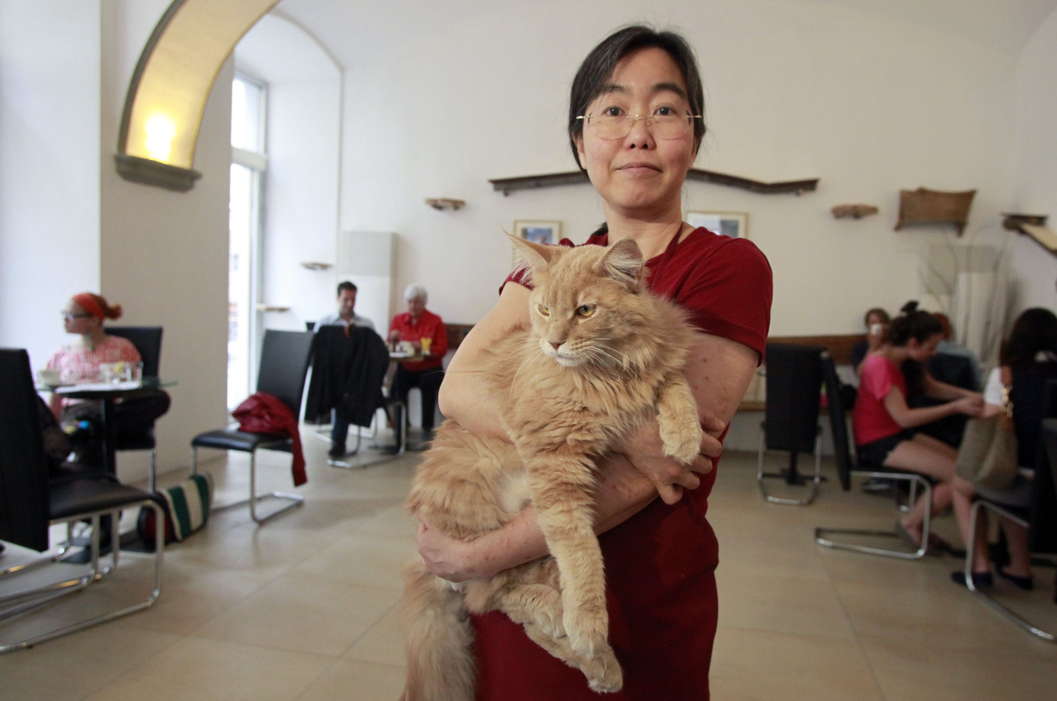 Η 47χρονη λειτουργεί το χώρο από την περασμένη Παρασκευή και οι πελάτες μπορούν να χαϊδεύουν και να απολαμβάνουν την παρέα των πέντε αιλουροειδών που είναι οι «οικοδεσπότες»: είναι οι Sonja, Thomas, Moritz, Luca και Momo και όλοι προέρχονται από καταφύγιο για αδέσποτα.