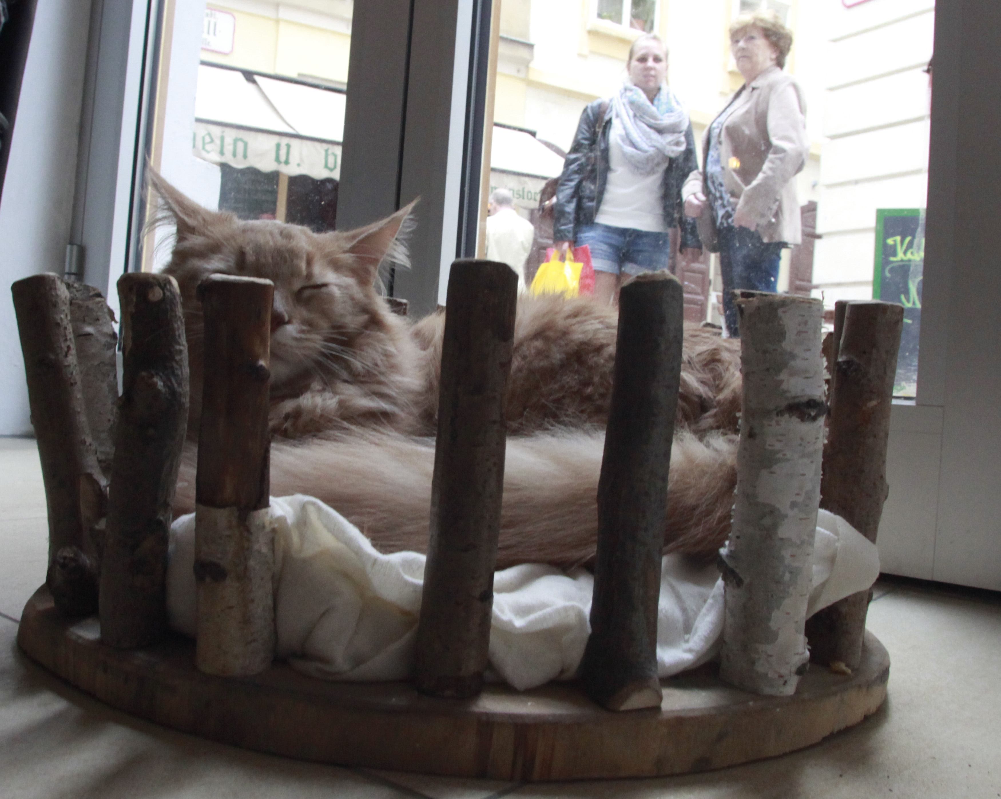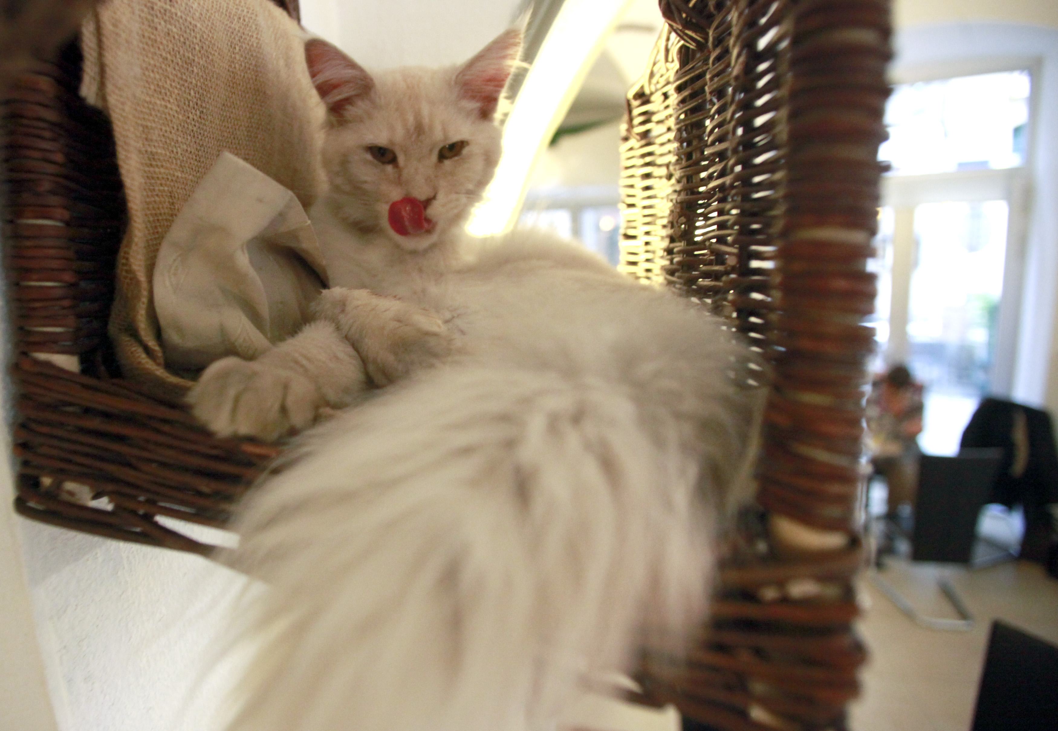 Μετά την αδέσποτη ζωή τους, σήμερα περιφέρονται ελεύθερα μέσα στο καφέ και παίρνουν τον υπνάκο τους στα πιο απίθανα- και βολικά- σημεία.