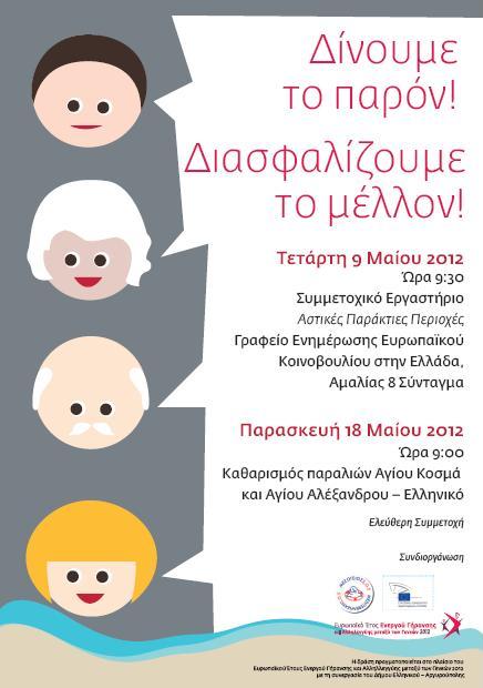 Περισσότερα από 50 μέλη από τα ΚΑΠΗ των δήμων Αχαρνών και Ελληνικού – Αργυρούπολης συμμετείχαν στο Συμμετοχικό Εργαστήριο με τίτλο «Αστικές Παράκτιες Περιοχές» που διοργάνωσαν η περιβαλλοντική οργάνωση Δίκτυο Μεσόγειος SOS, το γραφείο Ενημέρωσης του Ευρωπαϊκού Κοινοβουλίου και η αντιπροσωπεία της Ευρωπαϊκής Επιτροπής στην Ελλάδα.