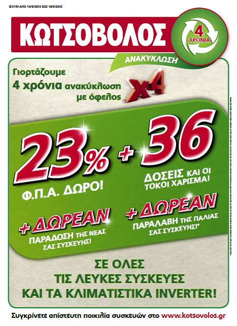 Έτσι στο διάστημα 14-19 Μαΐου 2012, κάνει δώρο σε όσους πραγματοποιήσουν μία νέα αγορά λευκής συσκευής ή κλιματιστικού inverter, τον Φ.Π.Α 23%, ενώ ταυτόχρονα θα προσφέρει 36 δόσεις με τους τόκους χάρισμα, δωρεάν παράδοση της νέας συσκευής στο σπίτι, αλλά και δωρεάν παραλαβή της παλαιάς συσκευής προς ανακύκλωση.