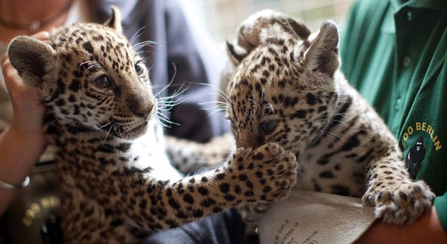 Τα χαριτωμένα μικρά γεννήθηκαν στον Ζωολογικό Κήπο του Βερολίνου τον Απρίλιο. Τα δύο κληρονόμησαν τις χαρακτηριστικές βούλες της μαμάς τους ενώ το τρίτο το μαύρο στιλπνό τρίχωμα του μπαμπά τους.