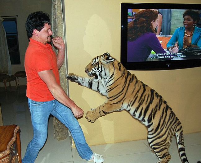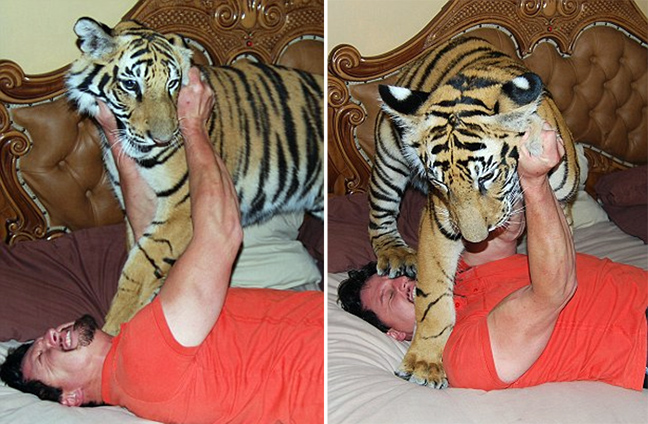 Δεν λείπουν βέβαια και τα παιχνίδια που είναι ασφαλώς πιο επικίνδυνα για τον Michael. «Το παιχνίδι με μία τίγρη μπορεί να είναι πραγματικά επικίνδυνο. Αν σε πιάσει στο λάθος σημείο, ακόμα κι αν δεν σε δαγκώσει και μόνο σε γρατζουνίσει με τα δόντια του, θα αιμορραγήσεις», λέει.