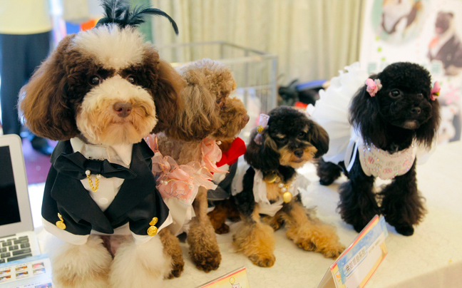 Διάδρομος για ζώα και μάλιστα με νερό, γαμπριάτικα κοστούμια και νυφικά, λουράκι με πολύτιμους λίθους είναι μερικά μόνο από τα αξεσουάρ για κατοικίδια που θα βρουν όσοι επισκεφθούν την έκθεση που άνοιξε τις πύλες της στην Ταϊπέι της Ταϊβάν.