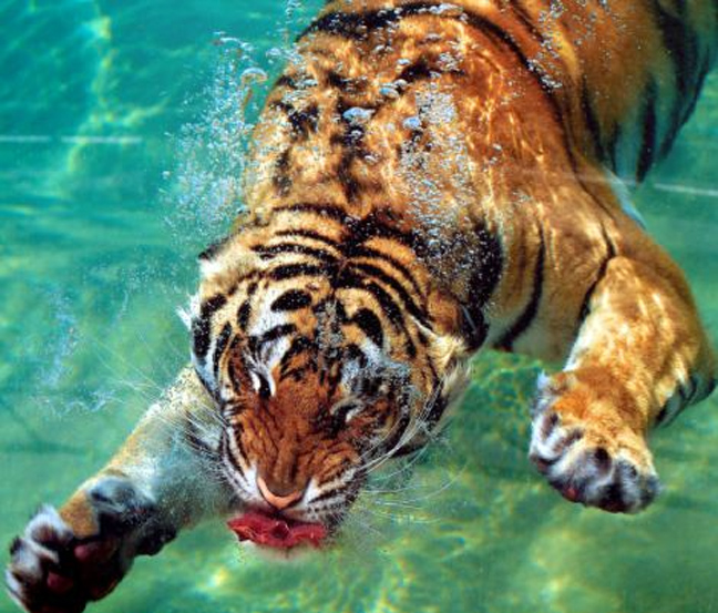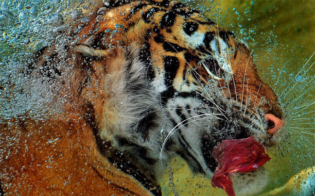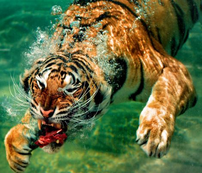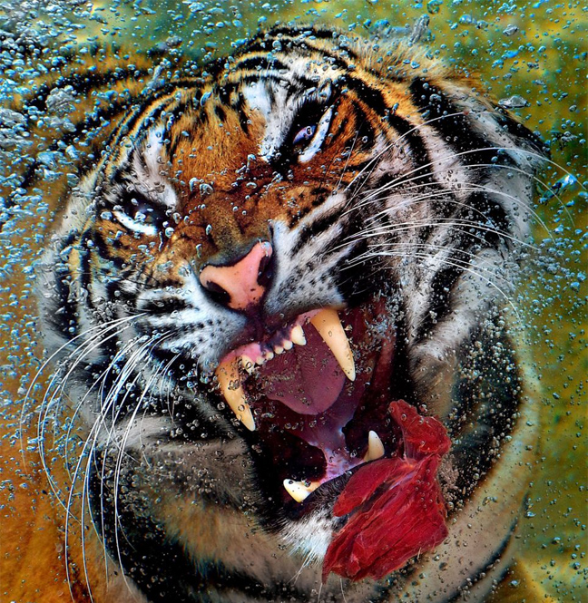 Αυτή η πεινασμένη τίγρης έχει ένα πράγμα στο μυαλό της. Να φάει όσο πιο γρήγορα γίνεται το ωμό κρεατάκι που της προσφέρουν οι υπάλληλοι του πάρκου Six Flags Discovery Kingdom Park στο Vellejo της Καλιφόρνια.