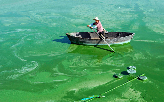 Η λίμνη Chaohu στην περιοχή Χεφέι της Κίνας έχε… γαλαζοπράσινα νερά αλλά όχι όπως τα εννοούμε εδώ στην Ελλάδα. Η επιφάνειά της έχει γίνει γαλαζοπράσινη λόγω της άλγης που έχει καλύψει τα πάντα.