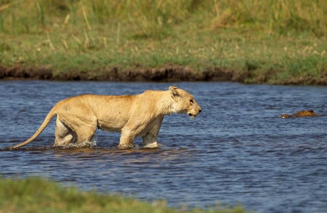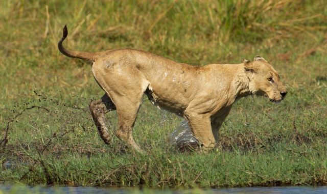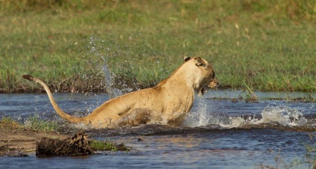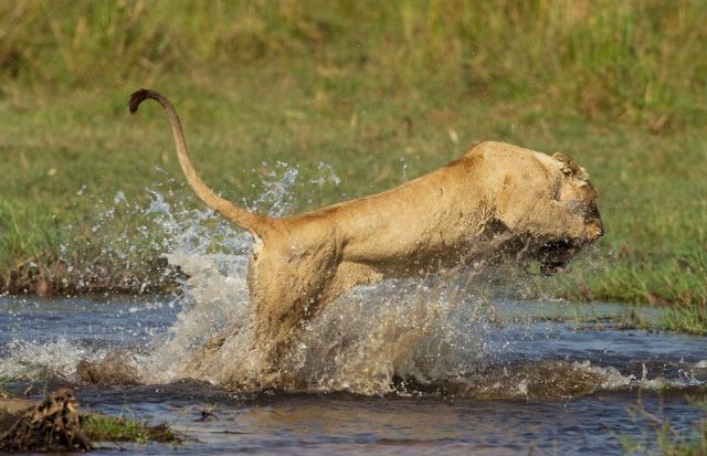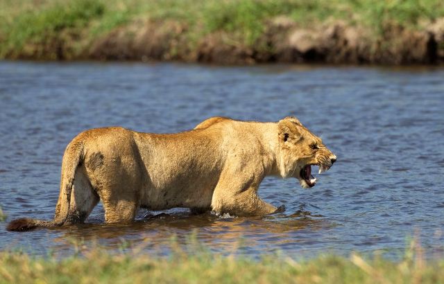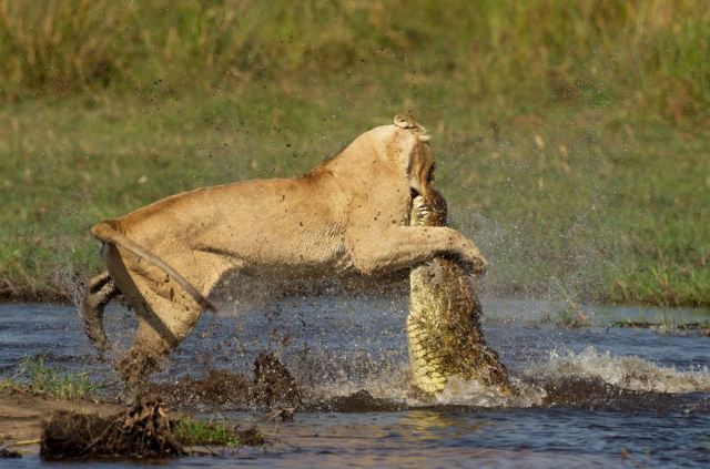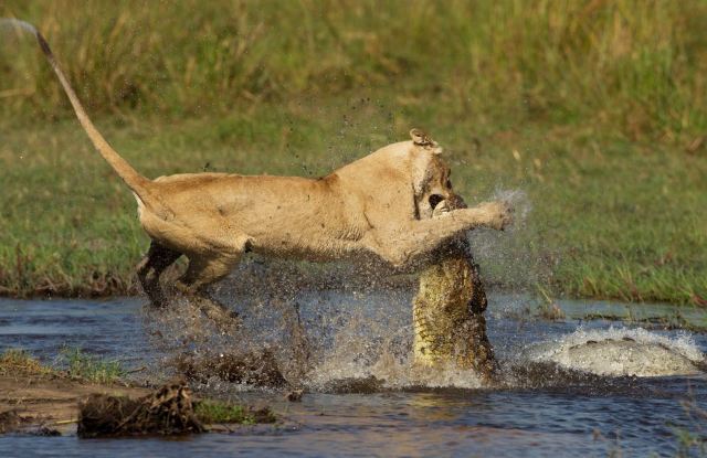 Αφού σάρωσε με τα μάτια της την επιφάνεια του νερού, η λέαινα εντόπισε την απειλή. Ένας κροκόδειλος βρισκόταν σε κοντινή απόσταση… κάτι που το θηλυκό λιοντάρι δε μπορούσε να ανεχτεί αφού συνοδευόταν από τα μικρά της!