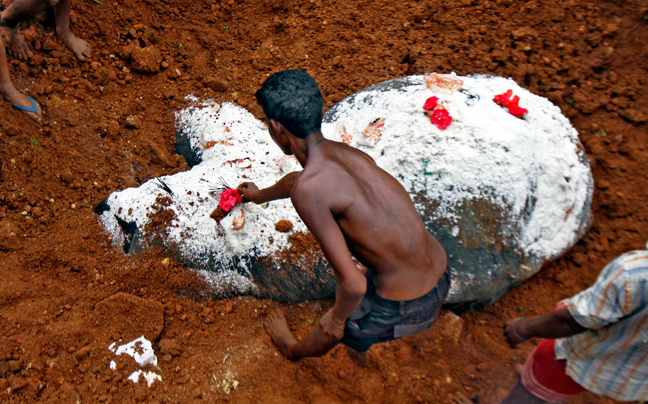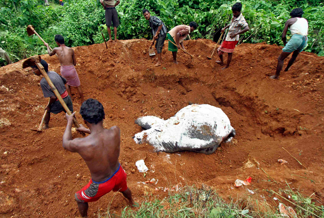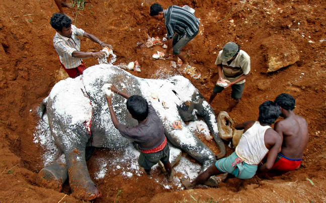 Οι ιδιοκτήτες αποχαιρέτησαν την ελεφαντίνα θάβοντάς τη στο χώμα και καλύπτοντάς τη με αλάτι- για να αποσυντεθεί ταχύτερα- και με λουλούδια.