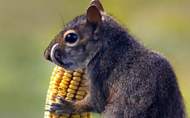 Ο μικρός θηλυκός σκίουρος φωτογραφήθηκε σε κήπο στο Μιζούρι καθώς πάλευε να φάει το καλαμπόκι. Τελικά βρήκε άλλη λύση αποσπώντας με το πόδι του τους σπόρους και ρίχνοντάς τους μες στο στόμα του.