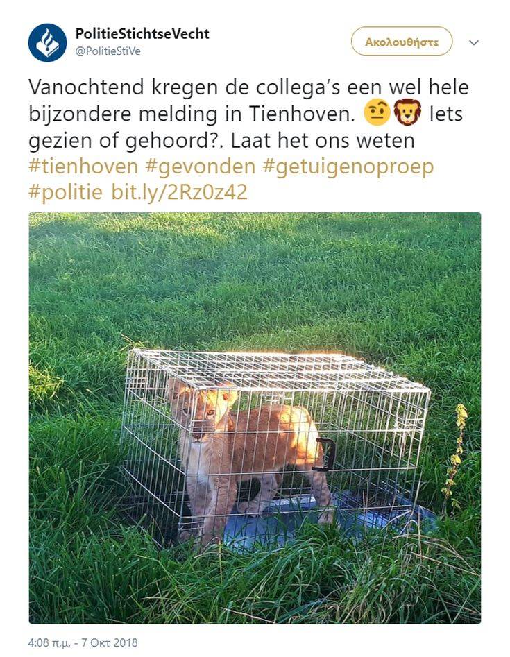 Το λιονταράκι, που είναι περίπου τεσσάρων μηνών, βρέθηκε σε ένα μικρό κλουβί έξω από την πόλη της Ουτρέχτης.