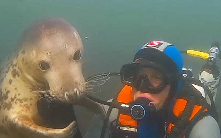 Μια φώκια πλησιάζει έναν δύτη με μόνο καλούς σκοπούς κατά νου.