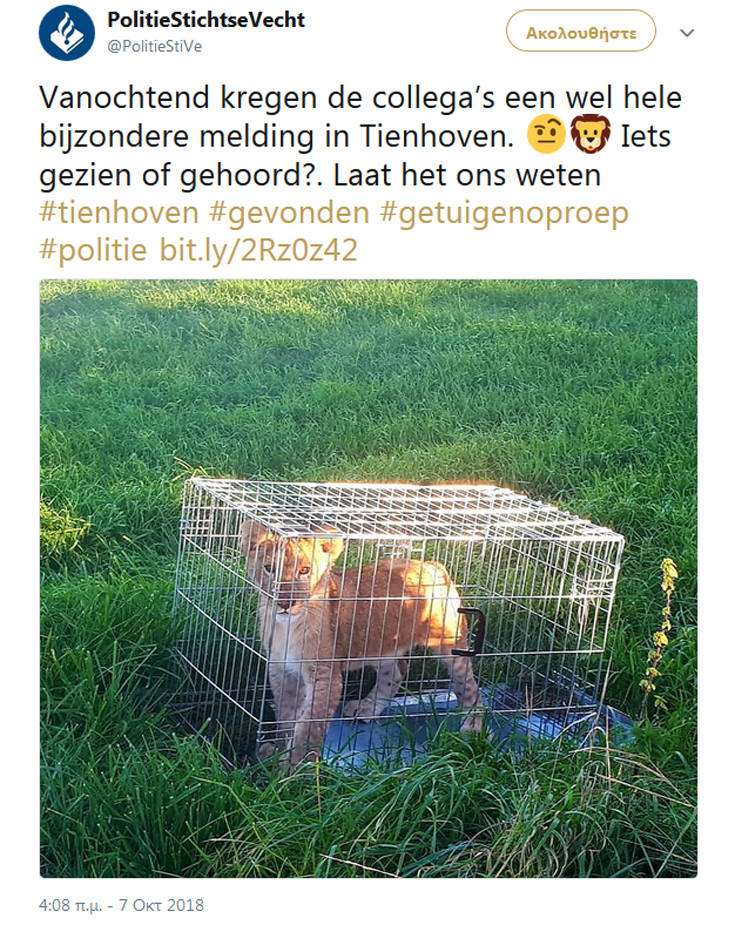 Σε ένα σημείο κοντά στην επαρχία Tienhoven υπήρχε παρατημένο ένα κλουβί με ένα μικρό λιοντάρι μέσα!
