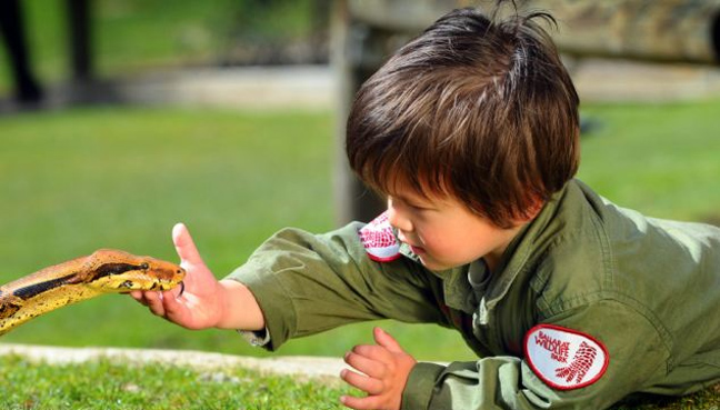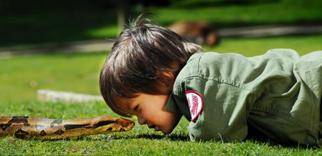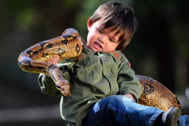 Μπορεί τα πόδια του αγοριού να τρέμουν κάτω από το βάρος του Pablo, ενός βόα 2,5 μέτρων- αλλά φόβος δεν υπάρχει.
