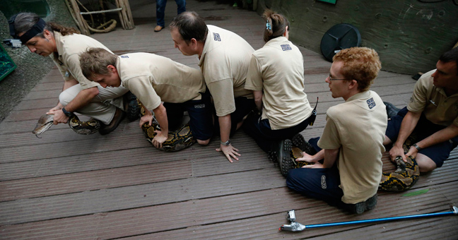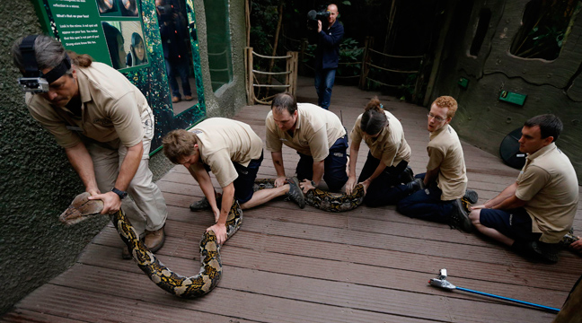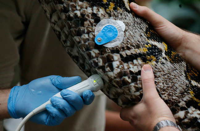 Οι δύο πύθωνες του ζωολογικού κήπου παίρνουν μέρος σε μία καρδιολογική έρευνα του Πανεπιστημίου Cardiff Metropolitan. Όσο για τον θεράποντα γιατρό του πύθωνα, αυτός είναι ο Eric Stohr του Πανεπιστημίου.