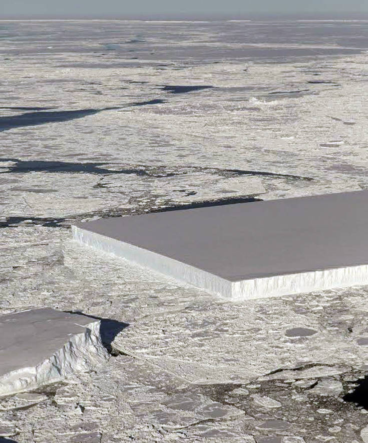 Στη φωτογραφία που έδωσε στη δημοσιότητα, δεν μπορεί παρά να θαυμάσει κανείς τη φύση, η οποία, μέσα σε όλη τη χαοτική τυχαιότητα που τη διέπει, μπορεί να παράγει σχεδόν τέλεια γεωμετρικά σχήματα σε τόσο μεγάλη κλίμακα. Σε γενικές γραμμές υπάρχουν δύο ειδών παγόβουνα: αυτά που μοιάζουν με τρίγωνο ή πρίσμα πάνω από την επιφάνεια του νερού (όπως αυτό που βύθισε τον «Τιτανικό») και εκείνα που είναι μακριά, πλατιά και επίπεδα σαν φέτα κέικ.