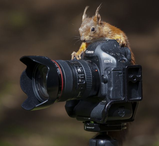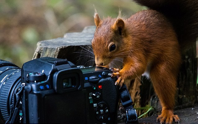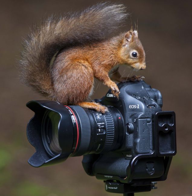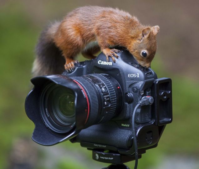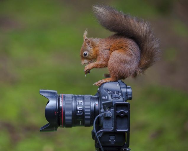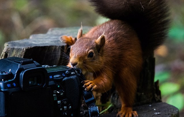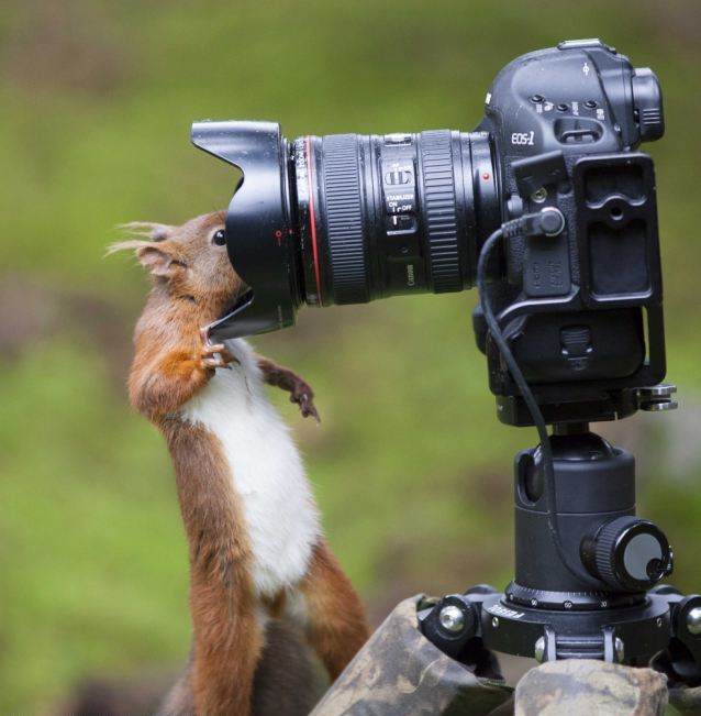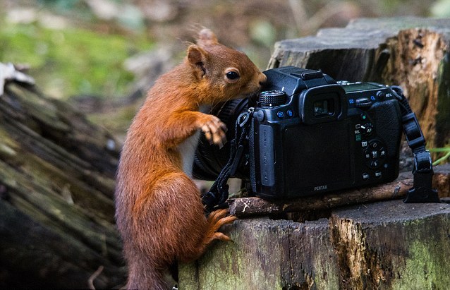 «Ο σκίουρος είχε το είδωλό του στην LCD οθόνη της κάμερας και αποφάσισε να “δοκιμάσει” λίγο για να δει αν είναι νόστιμη. Όταν ανέβηκε στην κάμερα δεν ανησύχησα αλλά όταν τον είδα να δαγκώνει τη γωνία με έλουσε κρύος ιδρώτας. Ήθελα να πεταχτώ να το διώξω, αλλά σκέφτηκα ότι θα χαλούσε η σχέση εμπιστοσύνης που είχαμε αναπτύξει μέχρι τότε. Ευτυχώς αμέσως μόλις ικανοποίησε την περιέργειά του με την κάμερα πήγε να κυνηγήσει έναν άλλο σκίουρο» είπε ο ίδιος.