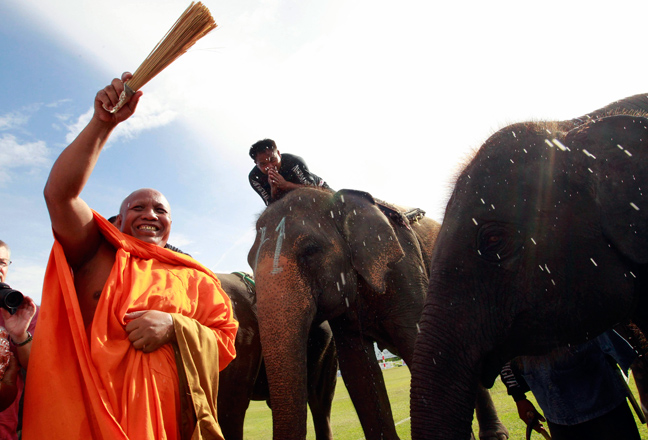 Η ρουτίνα είναι ίδια πριν από κάθε αγώνα: οι τετράποδοι συμμετέχοντες ετοιμάζονται, δροσίζονται πετώντας νερό με την προβοσκίδα τους, τρώνε ελαφρά, δέχονται την ευλογία του βουδιστή μοναχού και είναι πανέτοιμοι να ριχτούν στη μάχη!