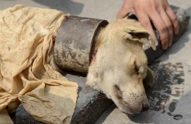 Μέλη φιλοζωικών οργανώσεων έσωσαν έναν σκύλο που βρήκαν να περιπλανιέται στους δρόμους της Taiyuan στην επαρχία Shanxi της Κίνας. Στο λαιμό του είχε περασμένο ένα σιδερένιο κολάρο, που το έπνιγε σιγά σιγά κάθε μέρα!